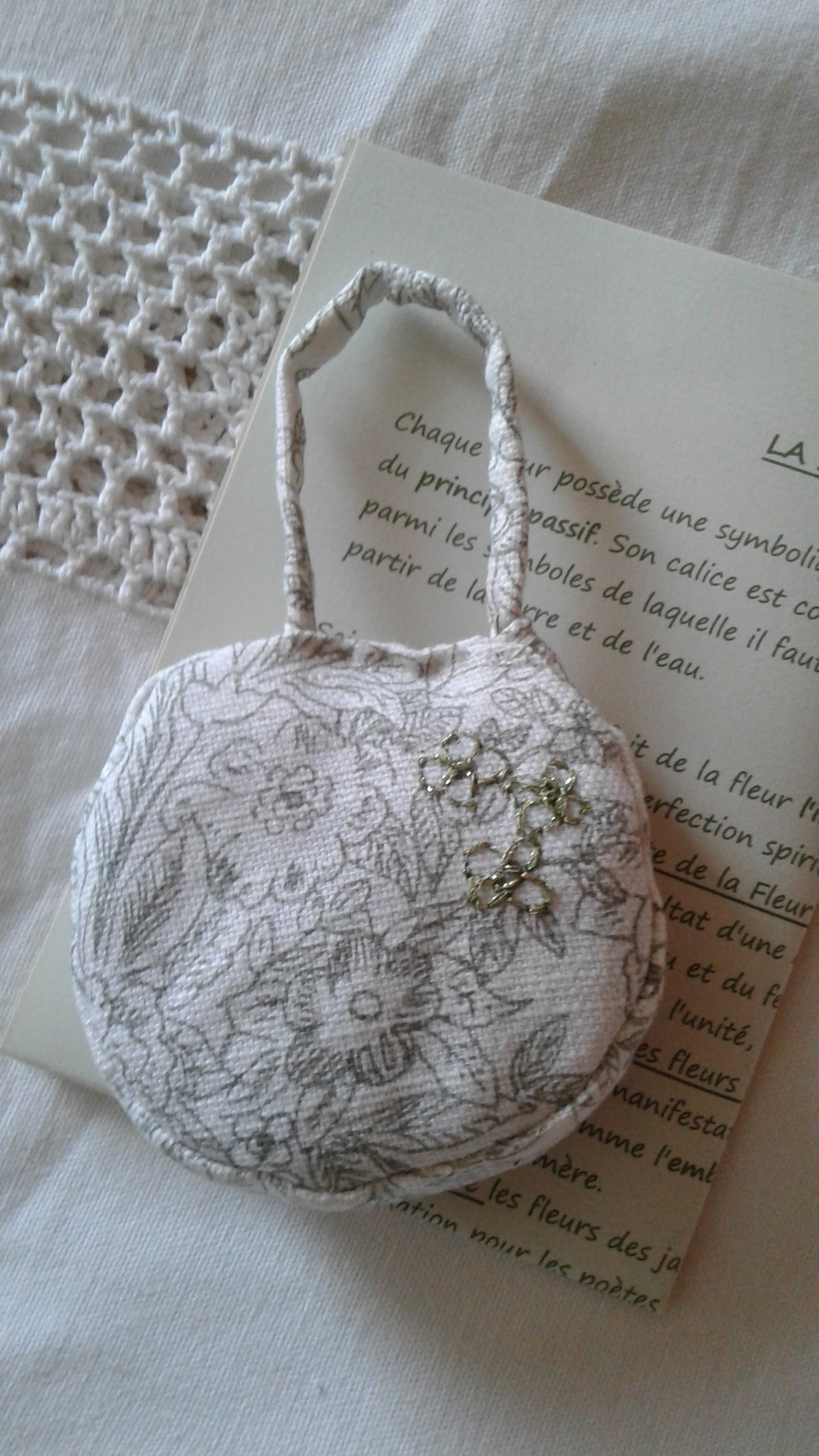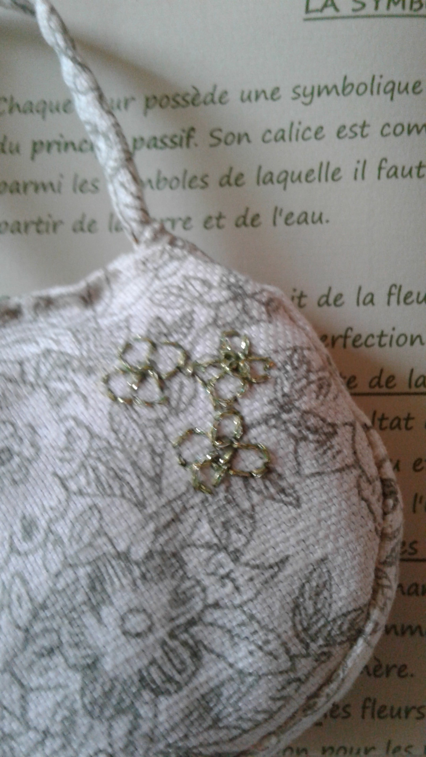 Sac de lavande en coton crème imprimé vert, aux motifs fleuris. Broderie en fil scintllant vert sur le devant.