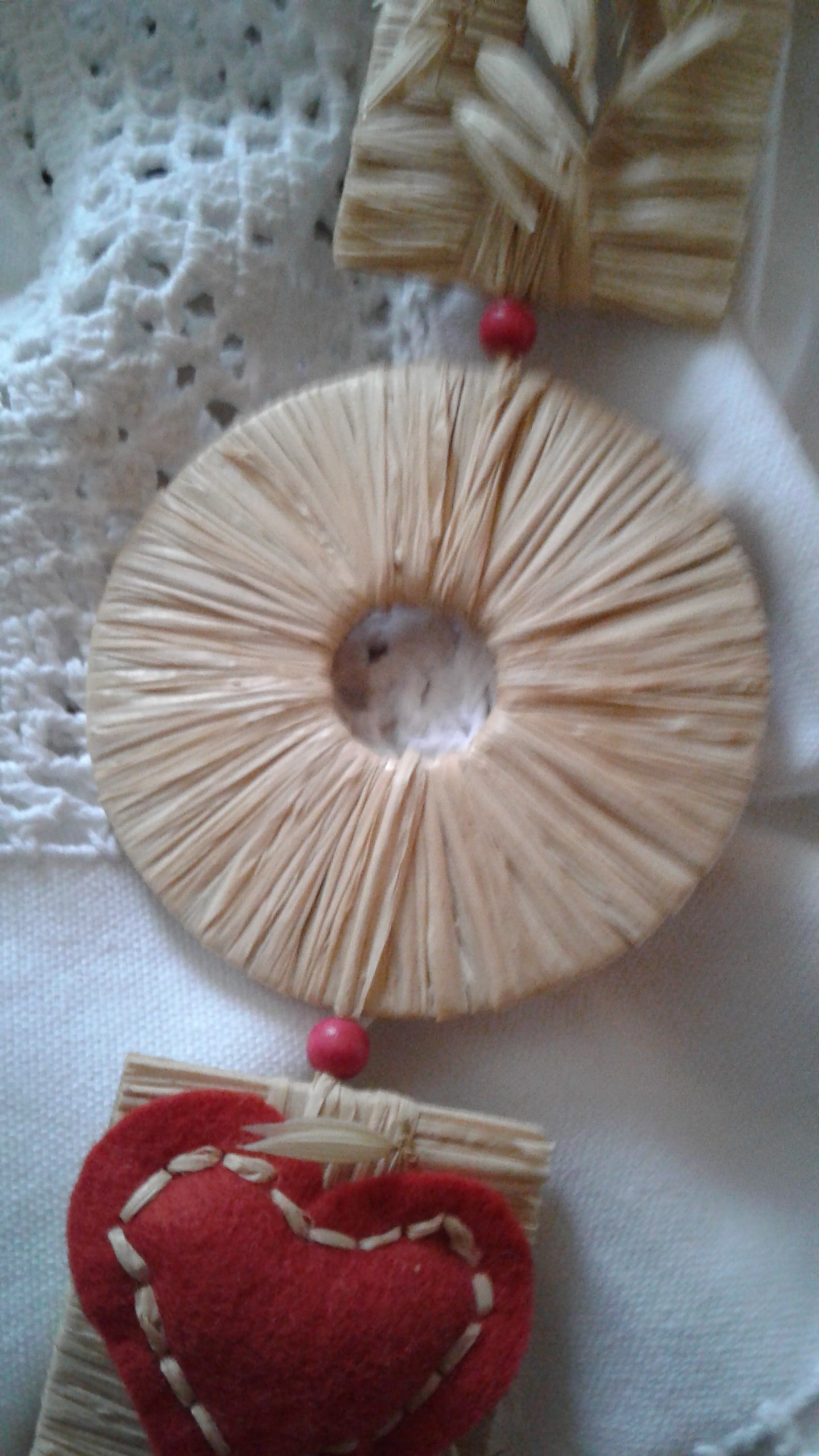 suspension décorative composée de paille montée sur bois, de coeurs en feutrine, d'avoine séchée, de perles en bois.