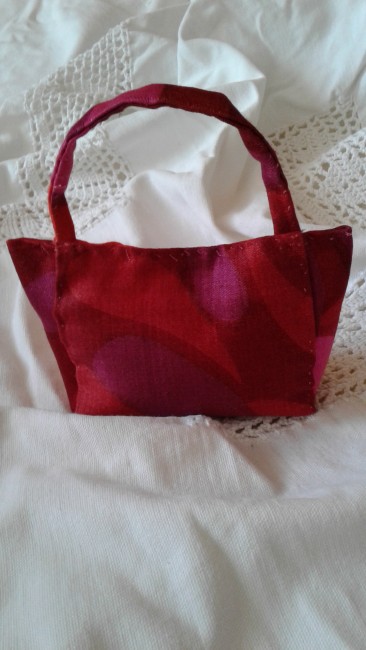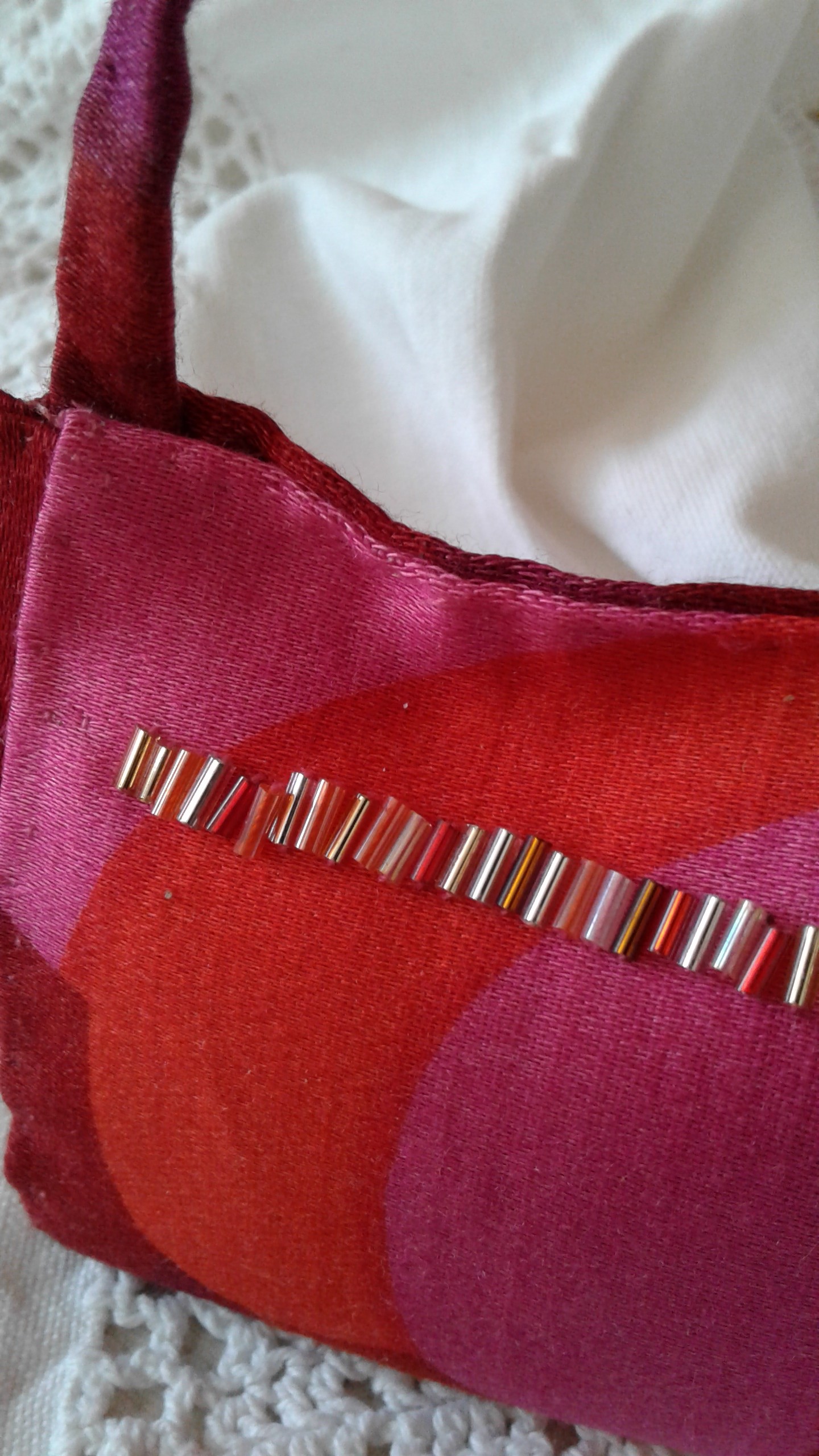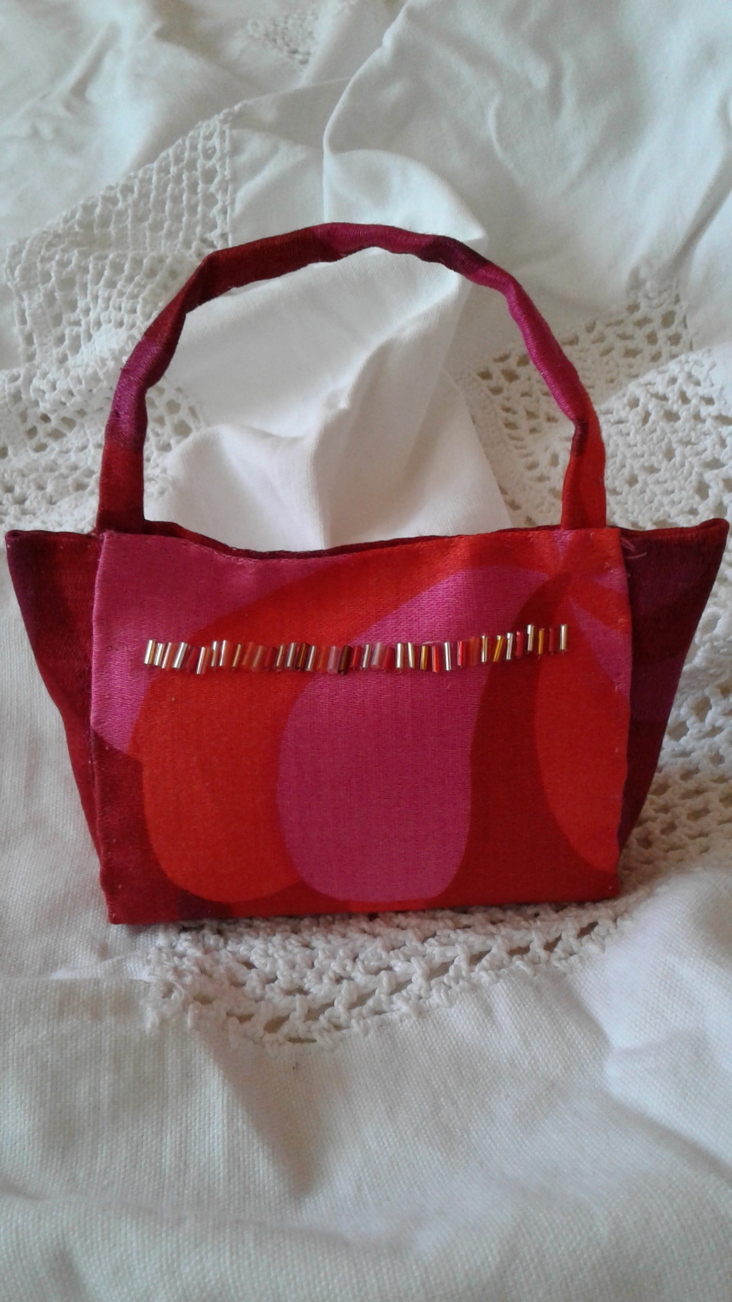 En tissu soyeux rouge, orange, rose. Fermé par couture. Perles sur le devant.