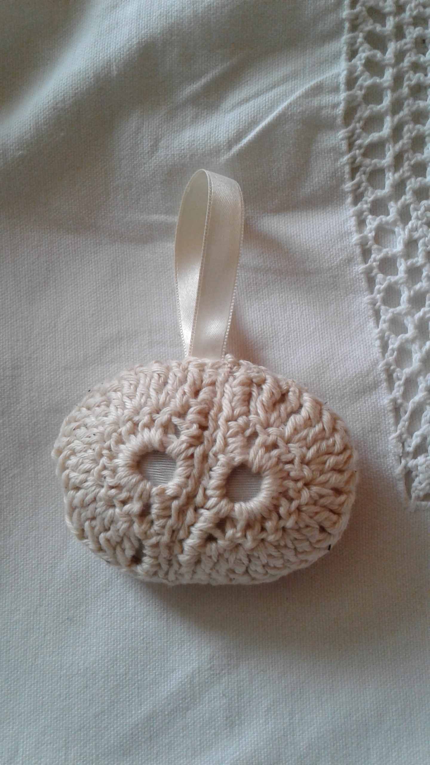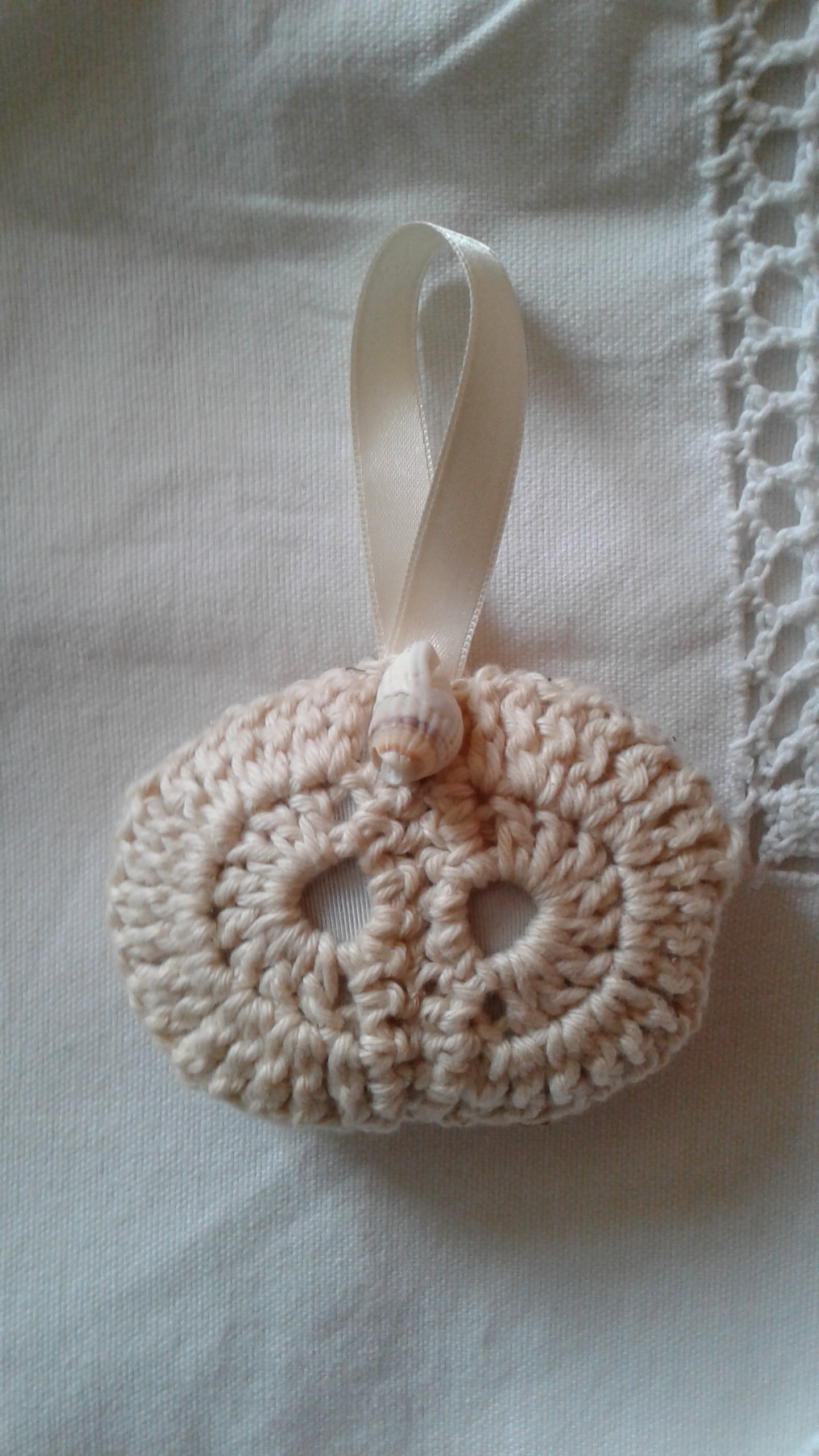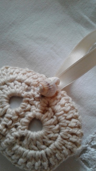 Sac crème. Coton au crochet, doublure tissu, paré d'un coquillage, anse en satin.